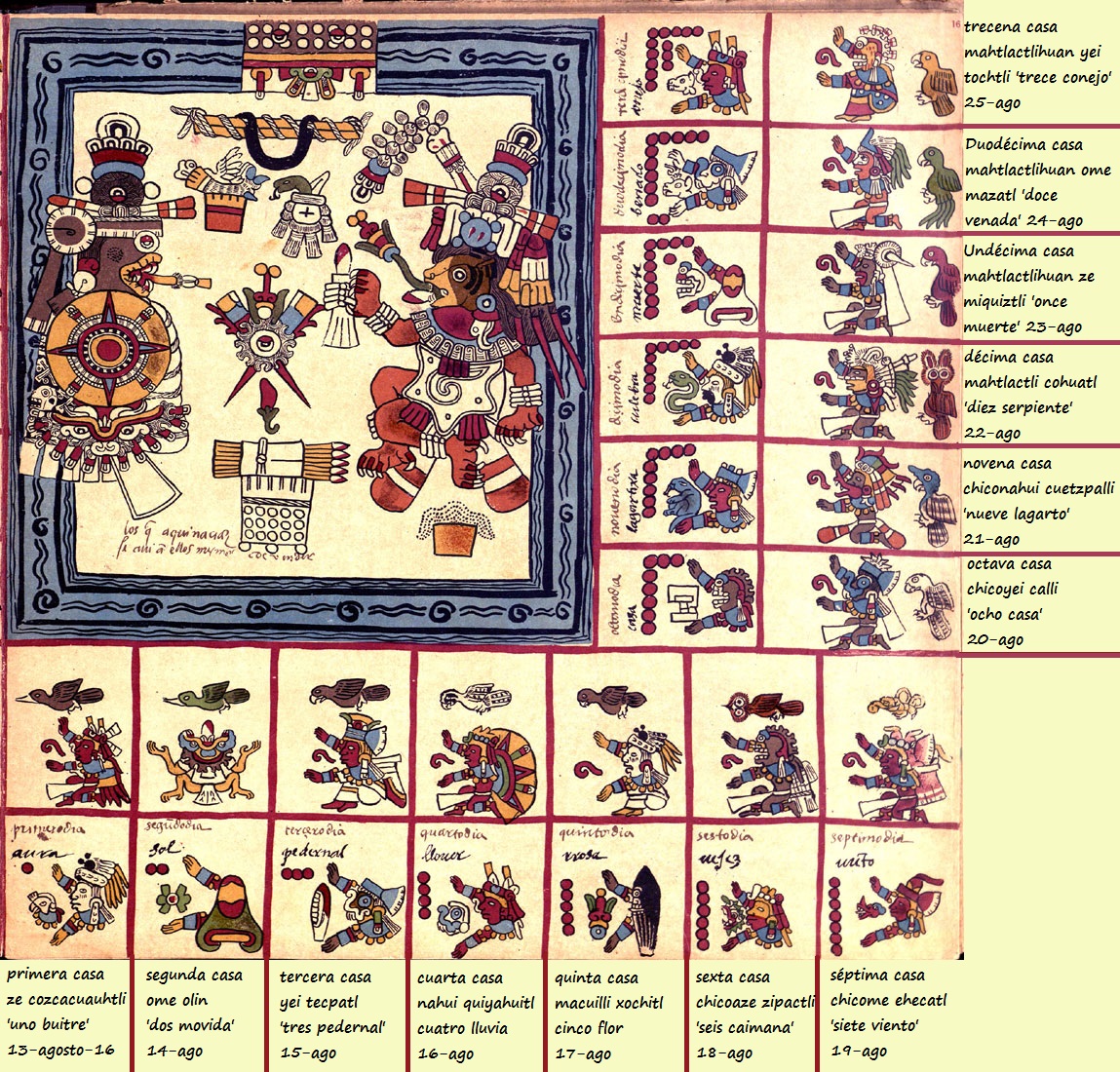 ð El numeral mahtlactlihuan yei ‘trece’ tiene como identidad diurna a Zitlalin icue ‘estrella su falda’, fuerza femenina de las estrellas, identificada con Mixcoahuatl ‘serpiente nubosa’, llamada Vía Lactea por los europeos. No tiene identidad nocturna. El ave presente es toznenetl ‘perico amarillo’.